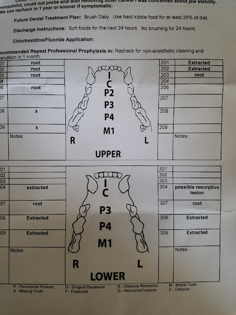 In total; Esme had 7 extractions and seven further root removals (root canals basically with no replacement caps). She had one incisor removed but thus far with all her swelling I can't tell which one it was.