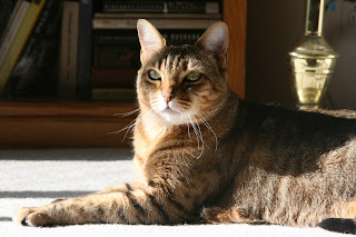 Miss Jenta is an 9 year old spayed female. She came to my house (Bengal rescue) after Mr. Aspen found his forever home June 2009. She has yet to be placed. She is a cancer survivor. While in my care she developed a growth on one of her hind toes which had to be removed. After so many trips back and forth to the vet for bandage changes (and a change of Vet) somewhere in there we bonded & I told her that if she never found a forever home; she would always have one here with me. Since the surgery was costly and rescue wanted to opt for the less costly option of euthanasia; I arranged my own online art auction and sent out the S.O.S. to help fund it. You can read about that here . It was hugely successful and from the letters and notes I got everyone was thrilled to help and very pleased with their pieces of art. While in my home she is confined to the master bedroom owing to her aggressive dominant nature. Something Ms. Stella and I are not quite happy with but as of now it's the only solution we have so we all must bend a bit.